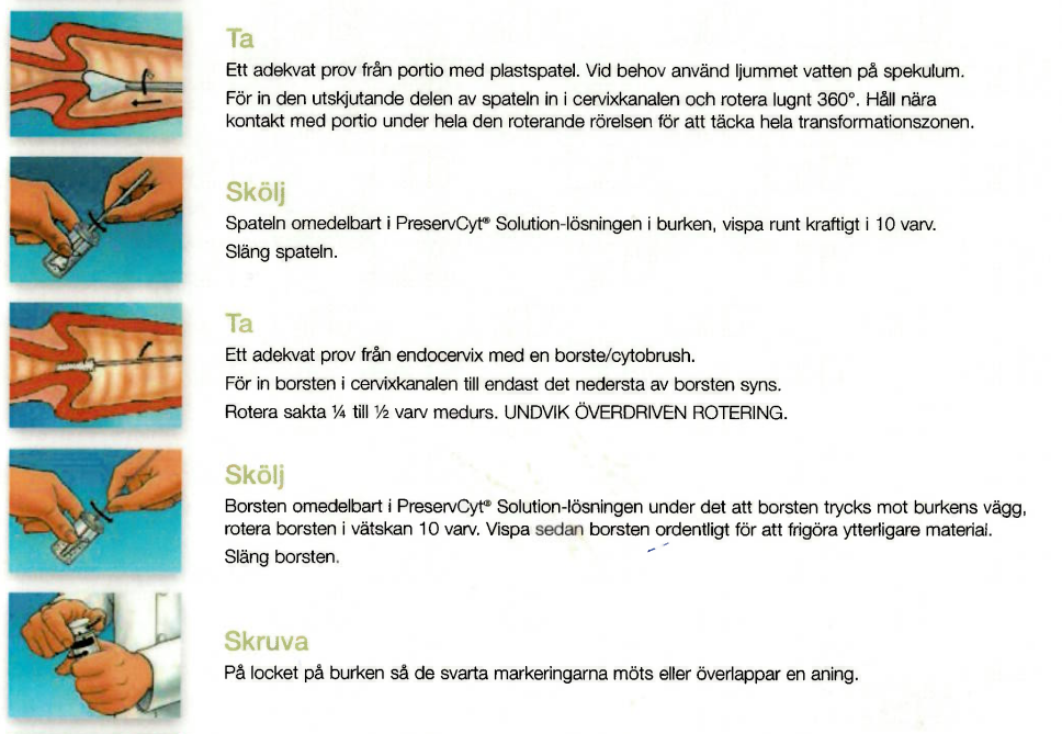 Utförande: Obs! Fixeringsmedlet PreservCyt® består till 50% av metanol och fixerar cellerna mycket snabbt. Därför är det viktigt att göra provöverföringen så snart som plastspateln respektive borsten förts ner i fixeringsmedlet. I annat fall kommer cellerna att fixeras till borste och spatel istället för att lösgöras till vätskan.