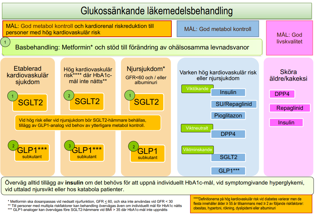 SGLT2-hämmare – överväg insättning vid hjärtsvikt, aterosklerotisk kardiovaskulär sjukdom eller diabetesnefropati. För gränsvärden gällande njurfunktion - se FASS.